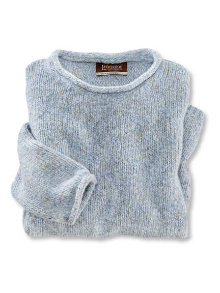 Echten Donegal Tweed erkennen Sie sofort an seiner einzigartigen Textur: die feinen, farbigen Einschüsse – "Flecks" –, die wie zufällig eingestreut wirken und an die Farbtupfer der irischen Natur erinnern. Der Schlüssel liegt im aufwendigen Spinnprozess. In einem einzigen Garn werden bis zu sechs verschiedene Farben meisterhaft versponnen, um diese einzigartige, lebendige Optik zu erzielen. Er wird auch für Strickwaren aus Donegal von Fisherman und Mucros Weavers eingesetzt