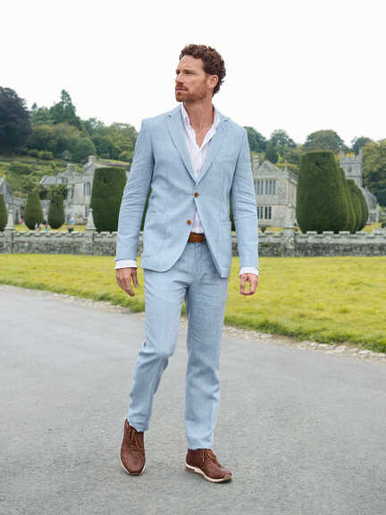Dieser Leinenanzug zelebriert den monochromen Look. Sakko und Hose in Hellblau stehen im Mittelpunkt und strahlen durch die natürliche Knitter-Optik des Leinens eine entspannte Eleganz aus. Statt der Krawatte übernimmt das locker gebundene Halstuch die Führung. So wirkt die Kombi künstlerischer und weniger steif. Doch der entscheidende moderne Bruch gelingt durch die braunen Leder-Sneaker: Sie nehmen dem Anzug die letzte Formalität und machen den Look bereit für den Spaziergang an der Promenade.