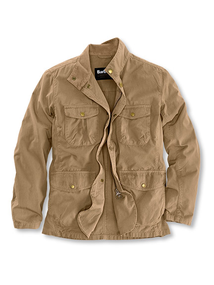 Das halbärmelige Leinenhemd ist wie gemacht für frische Frühlingstage, an denen die Sonne sich noch Zeit lässt. Darüber die Garment-Dyed-Jacke in Beige mit Taschen für alles, was unterwegs dabei sein soll. Am Fuß ein moderner Retro-Sneaker, und das Barbour-Bandana setzt den Abenteuer-Akzent.