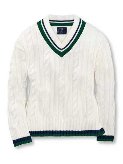 Ein V-Pullover im Retro-Tennislook, offwhite und entspannt wie nach einem Satzsieg, trifft auf eine gestreifte Collegelook-Bluse, die sofort Schliff reinbringt.