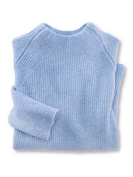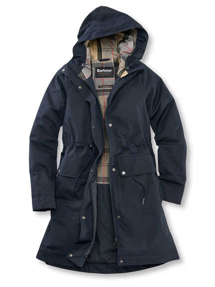 Ein Barbour-Parka, der Regen und Wind gelassen trotzt, dazu ein eisblauer Softwool-Pullover – schlicht, weich und unkompliziert.