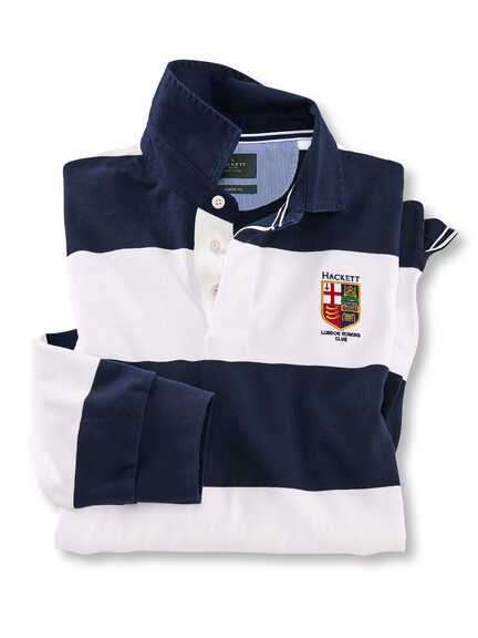 Das Rugbyshirt mit gesticktem Wappen ist keine Frage des Geschmacks, es ist die Antwort darauf. Cord-Bermuda in Dark Blue dazu, Bootsschuh in Kastanienbraun an die Füße, gewachste Canvas-Reisetasche über die Schulter und schon ist klar: Dieser Mann hat einen Plan.